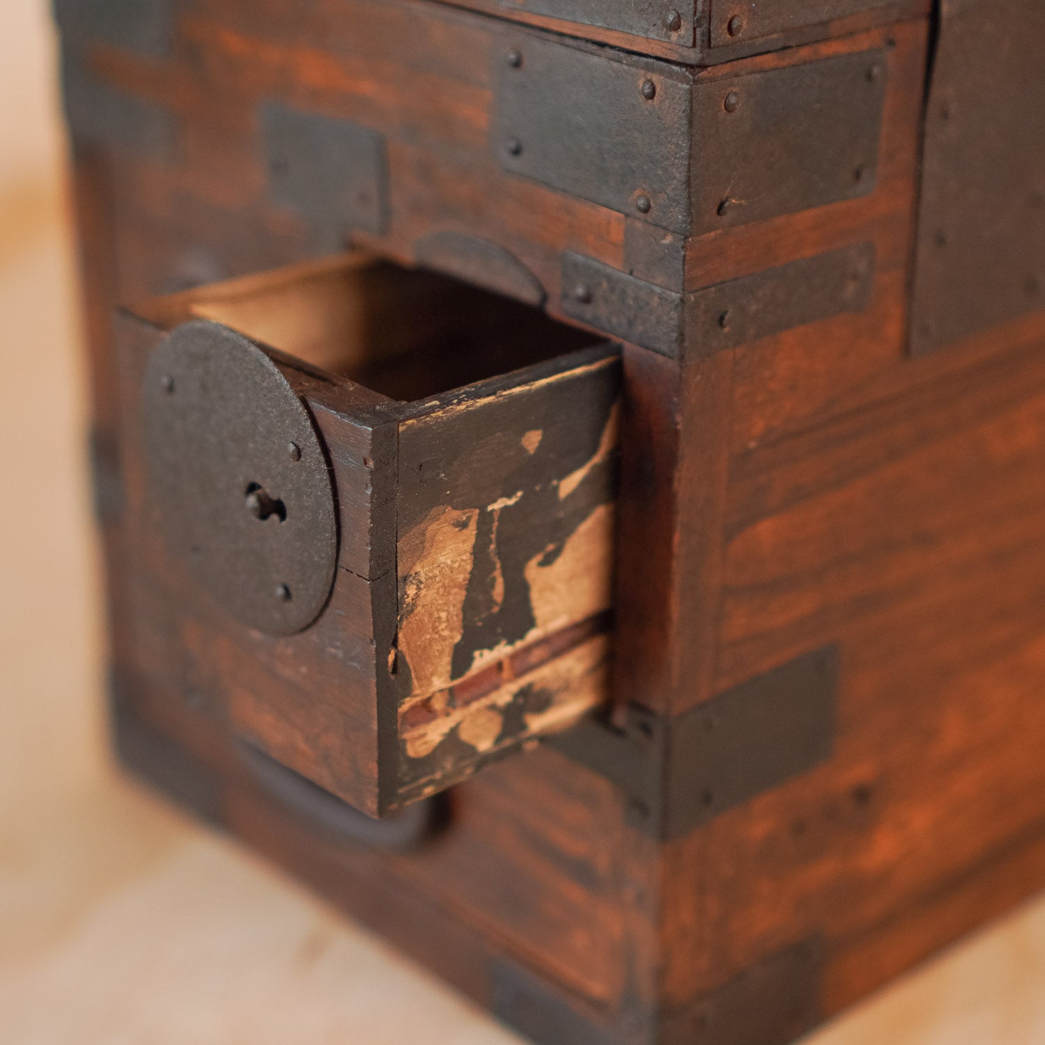 Antique Japanese 3 Drawer Suzuri Bako Sugi wood and Iron Calligraphy Box