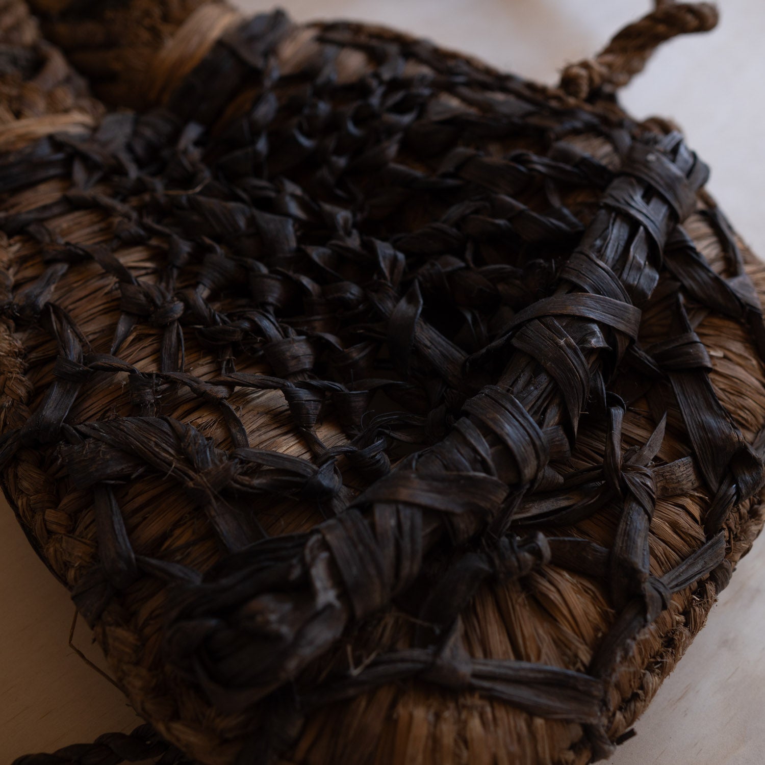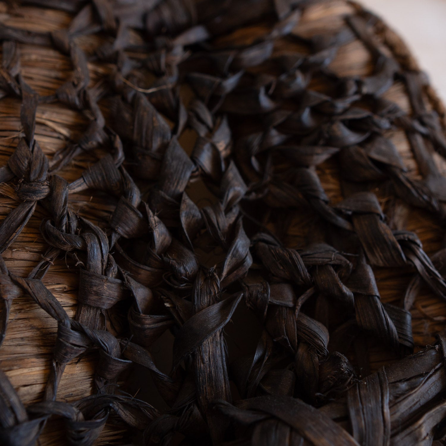 This one is woven from straw and has a striking dark woven pattern in another natural material over the top creating a stark contrast with lighter straw.