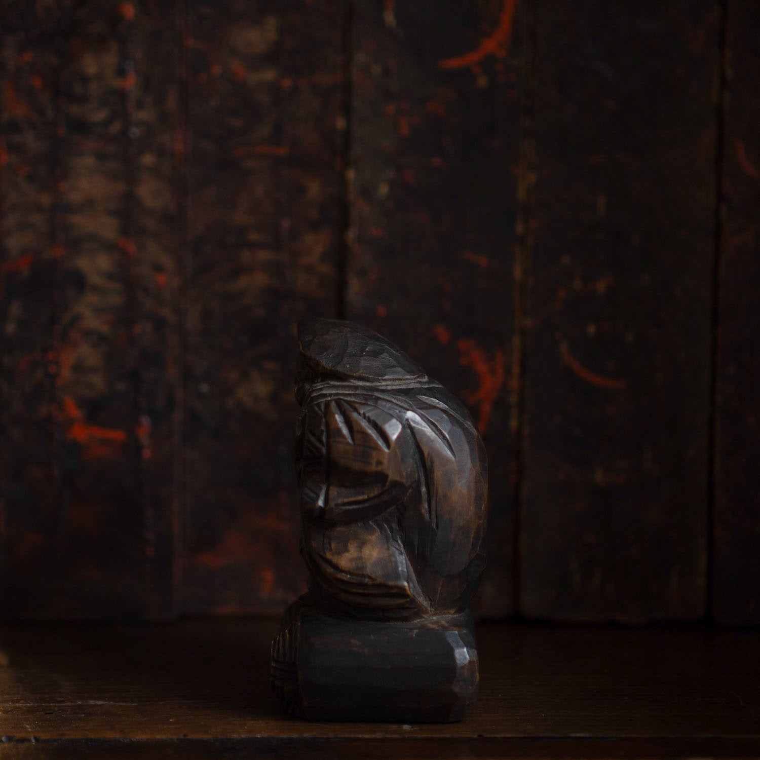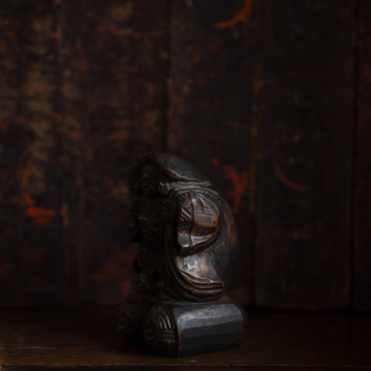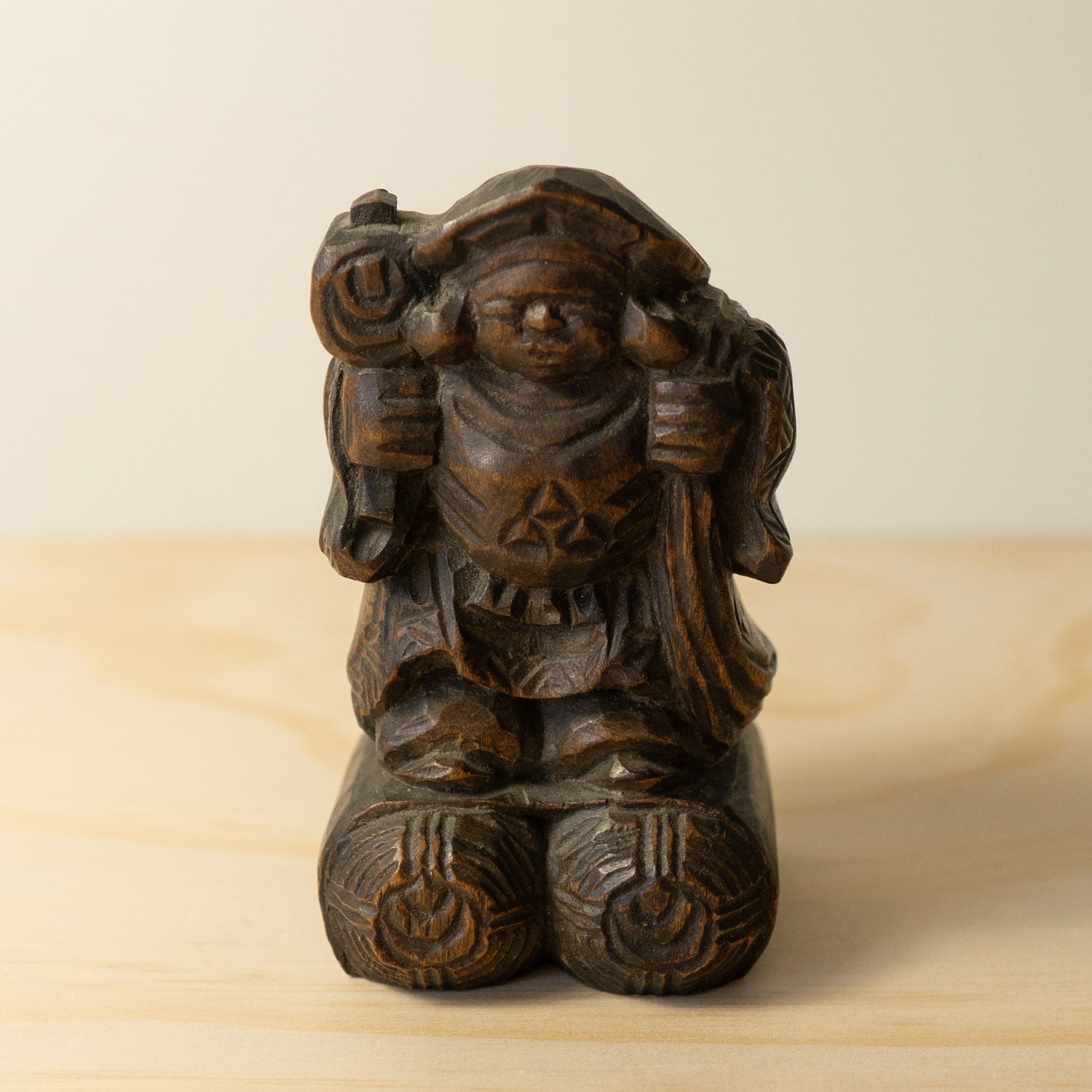 "This statue of Daikokuten is one of the most popular depictions of this god in Japan. Although we have introduced many other wood carvings, this one is carved relatively skillfully. But what do we mean by "skillful"? We primarily introduce Buddhist and Shinto figures known as "Minshūbutsu" (Folk Buddhist Objects), which were carved by common townspeople in Old Japan.