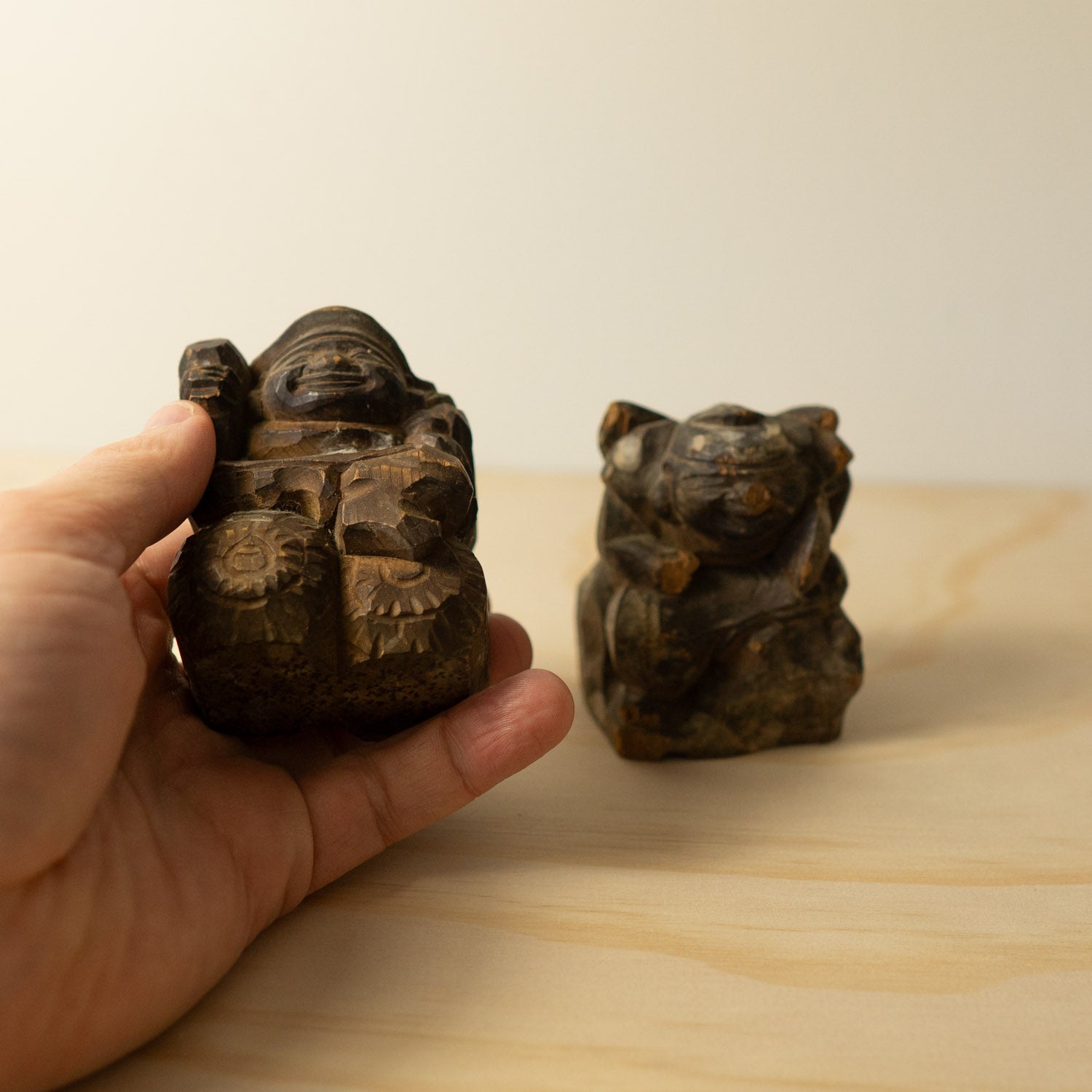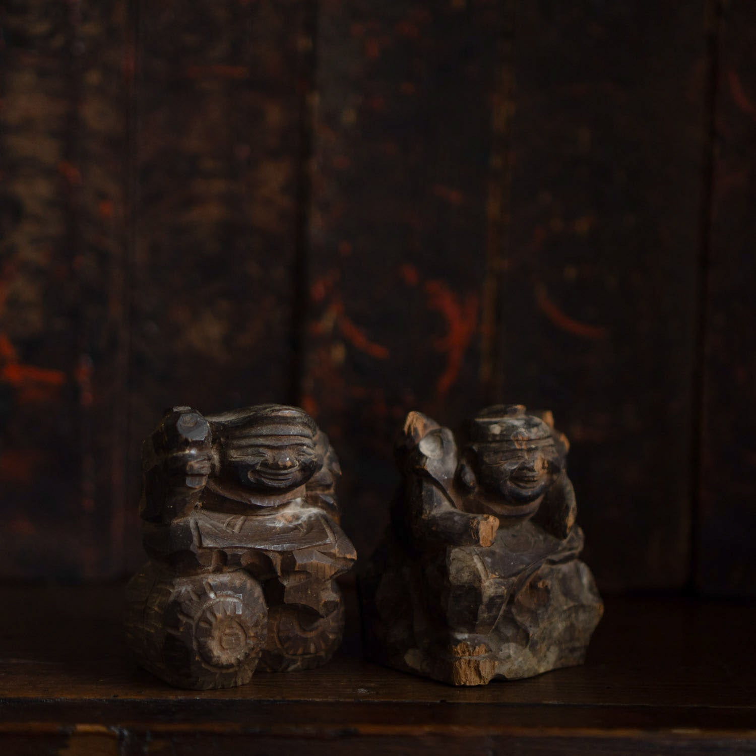 "This is a pair of wood carvings themed on Daikoku and Ebisu, the most familiar and beloved gods in Japan.