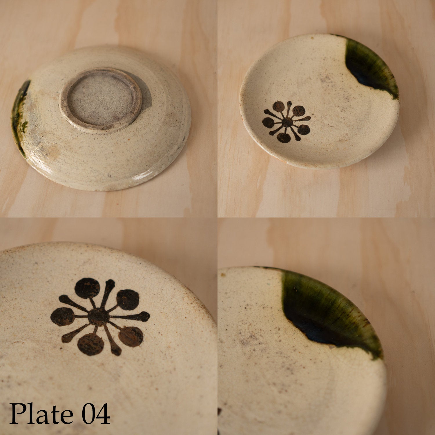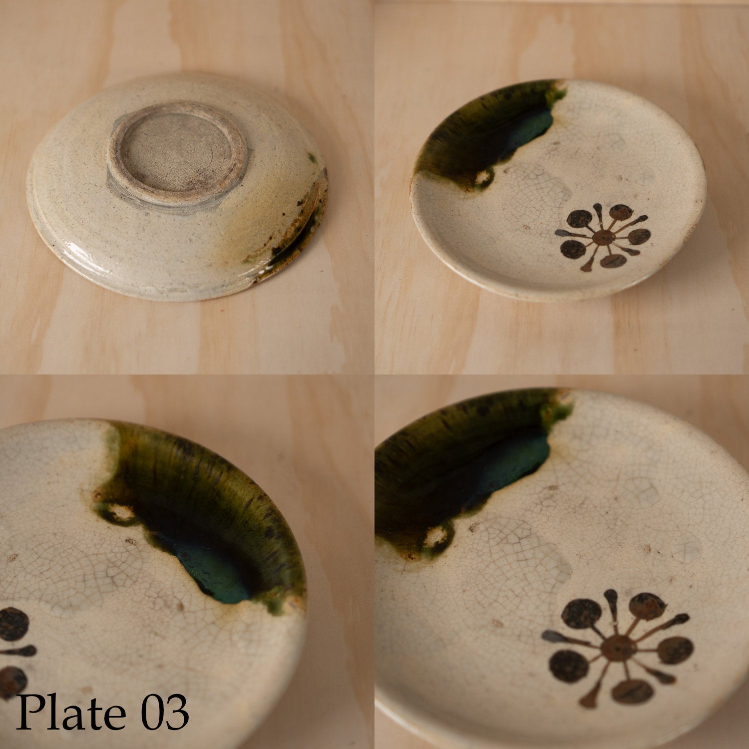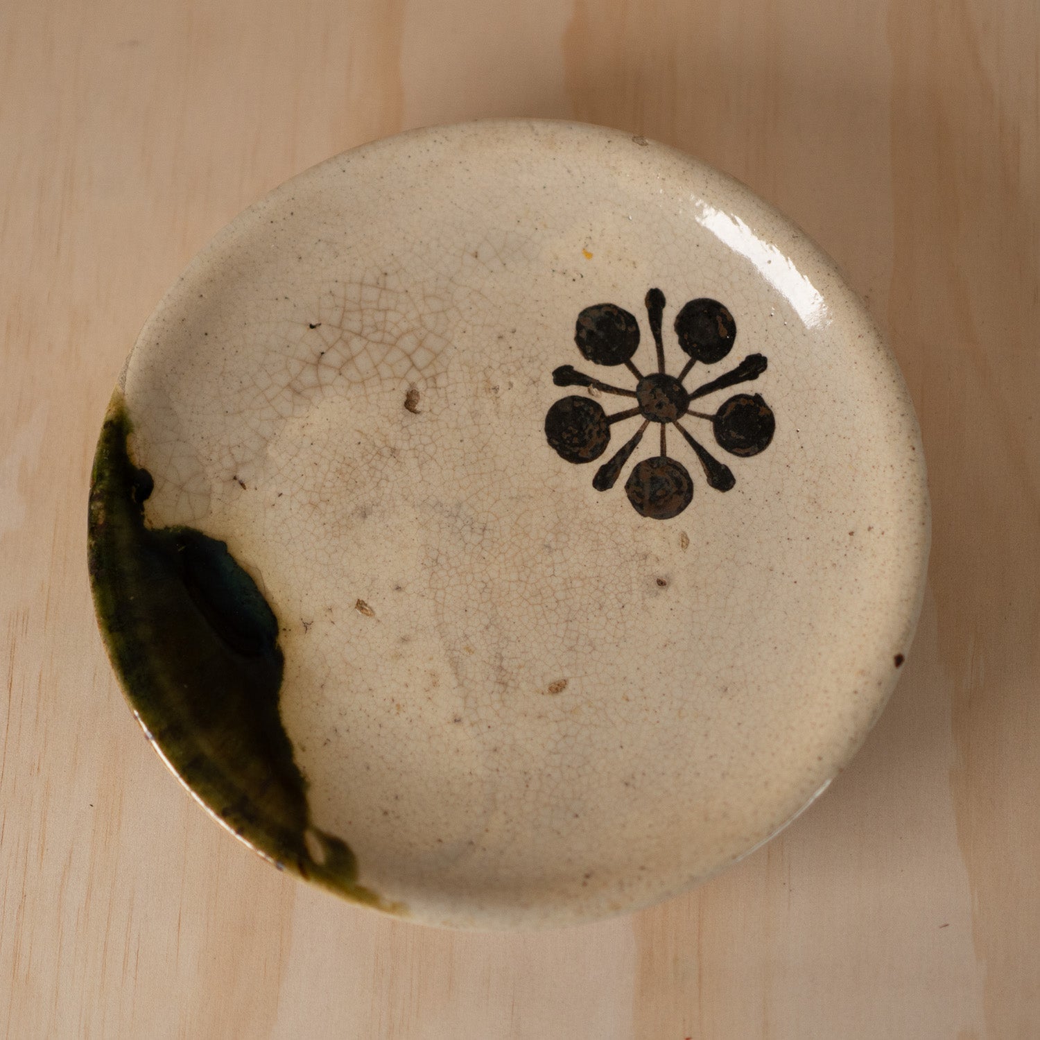 Featuring a cream crackled glaze with Oribe Green glazed detail and iron painted flower detail. Plates like this were often used in Inns for serving food to guests, often from an even larger plate.