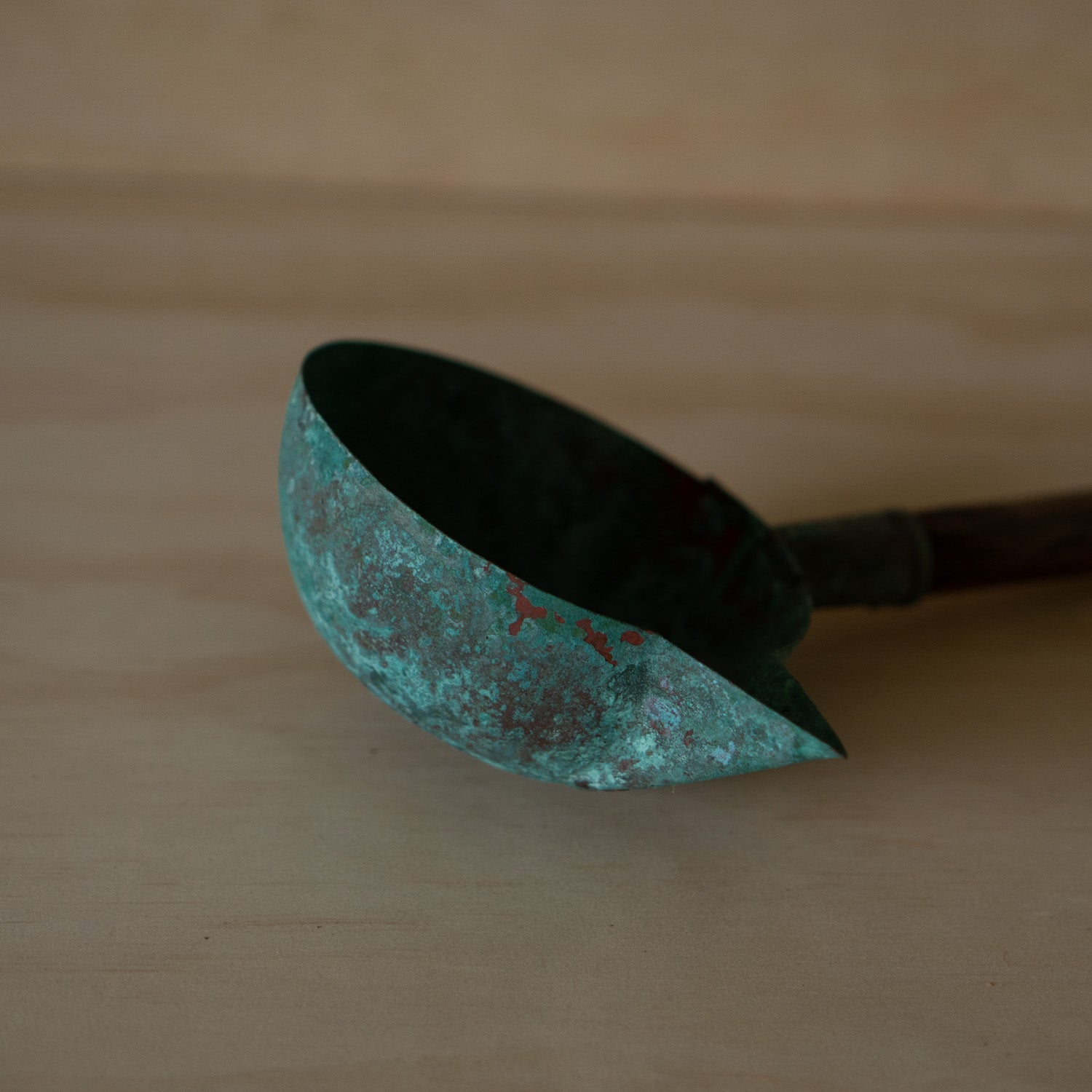 A beautifully patinated copper ladle from Japan, crafted in the late Meiji to early Showa period (c. 1880–1940). Unlike the shallow bamboo hishaku used in temples for ritual purification, this example has a deep rounded bowl and a pronounced triangular spout—features associated with kitchen and workshop use rather than ceremonial contexts.