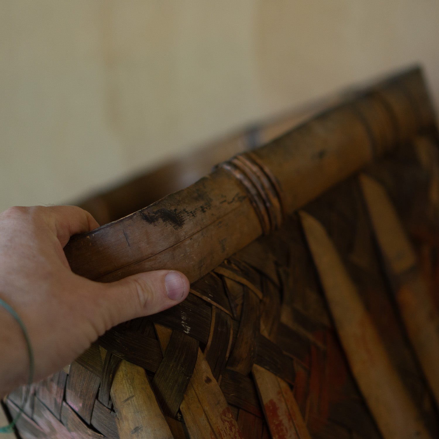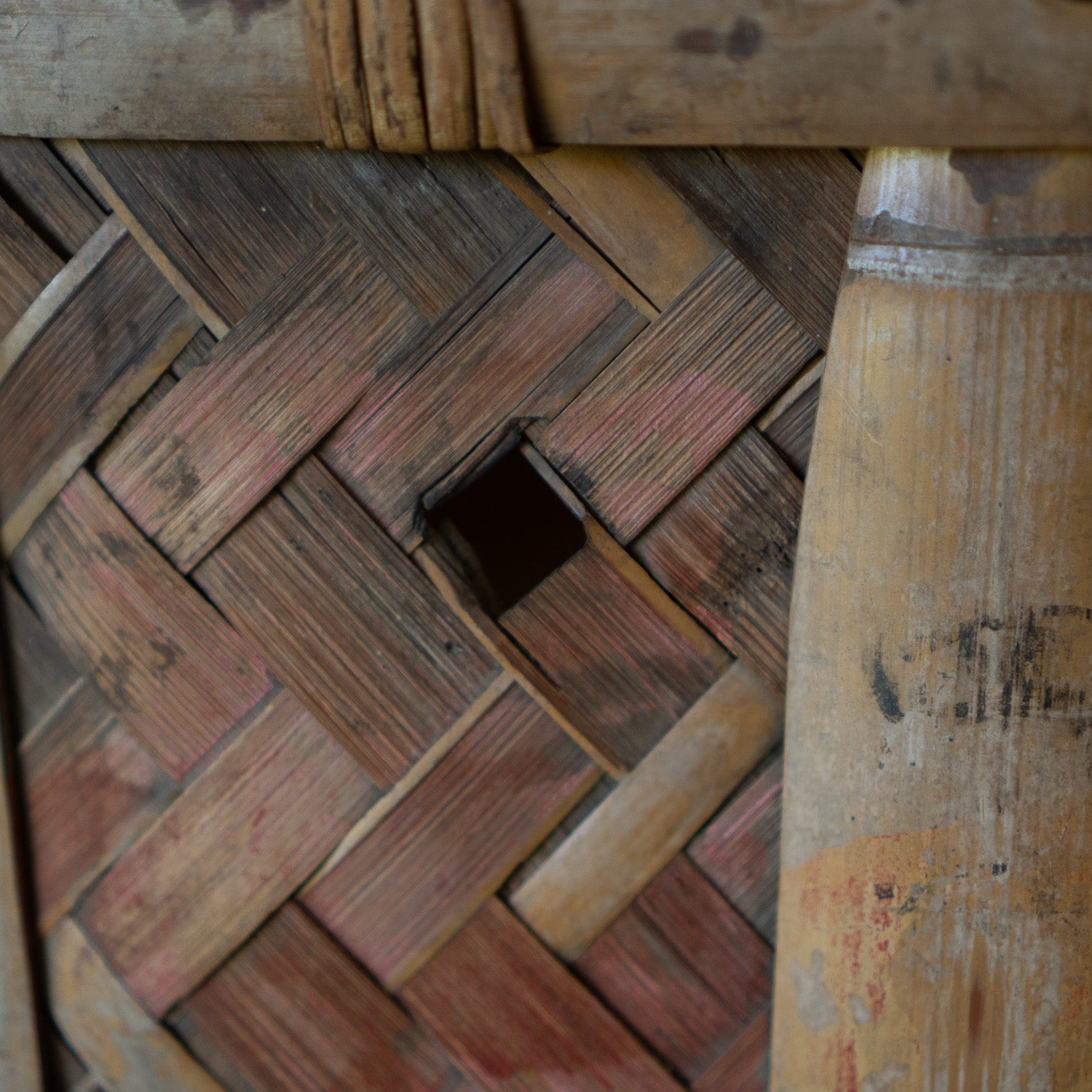 The rectangular form, sturdy rim, and strengthened corners are typical of shūkaku-kago — baskets designed to be carried to the fields and filled with weight. Traces of red pigment remain on the exterior slats, a practical mark once used to identify a household or farm. The bamboo has developed a rich, warm patina from decades of handling and sunlight, giving the basket a gentle wabi-sabi character.