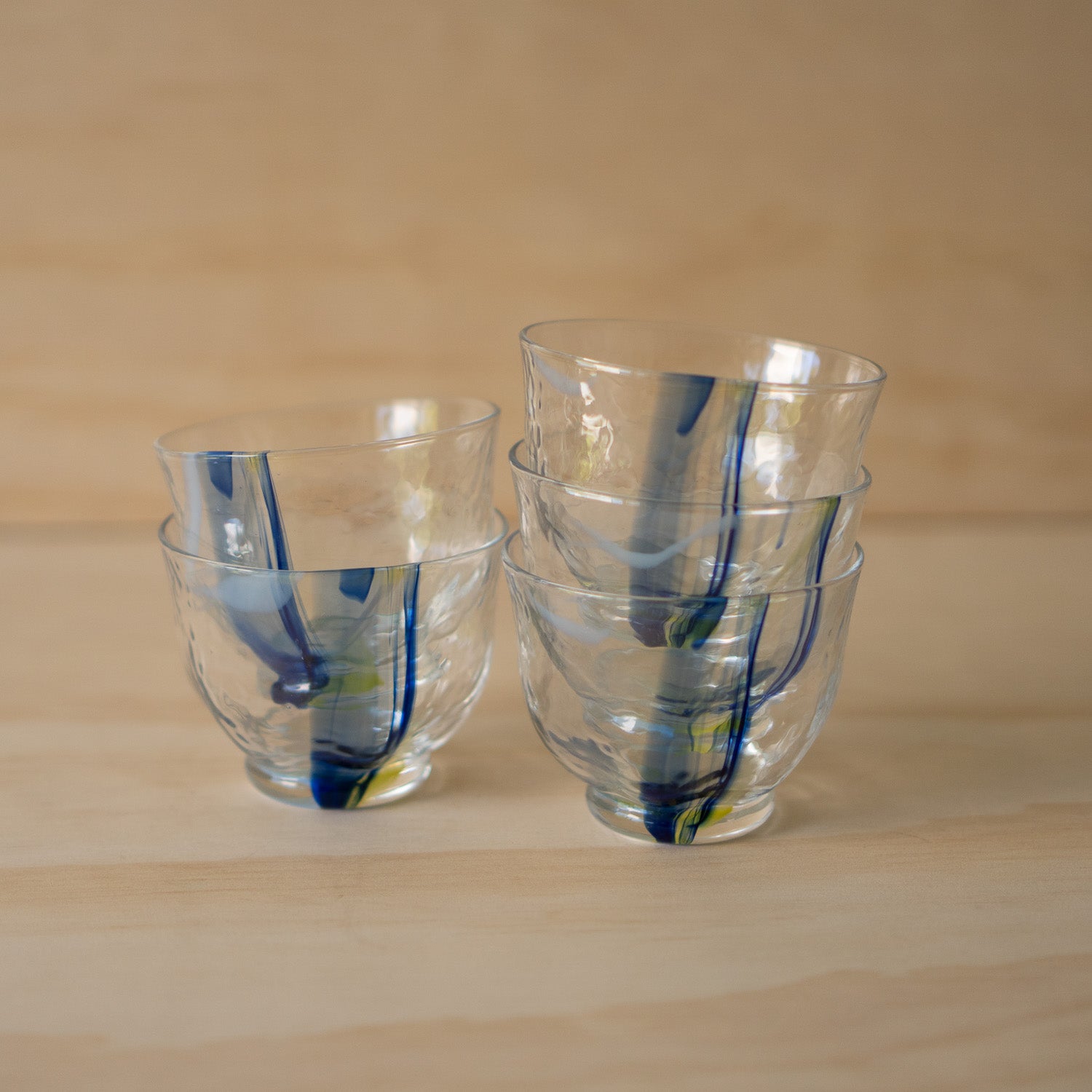 Beautiful handmade glasses with blue, white and yellow swirly details.