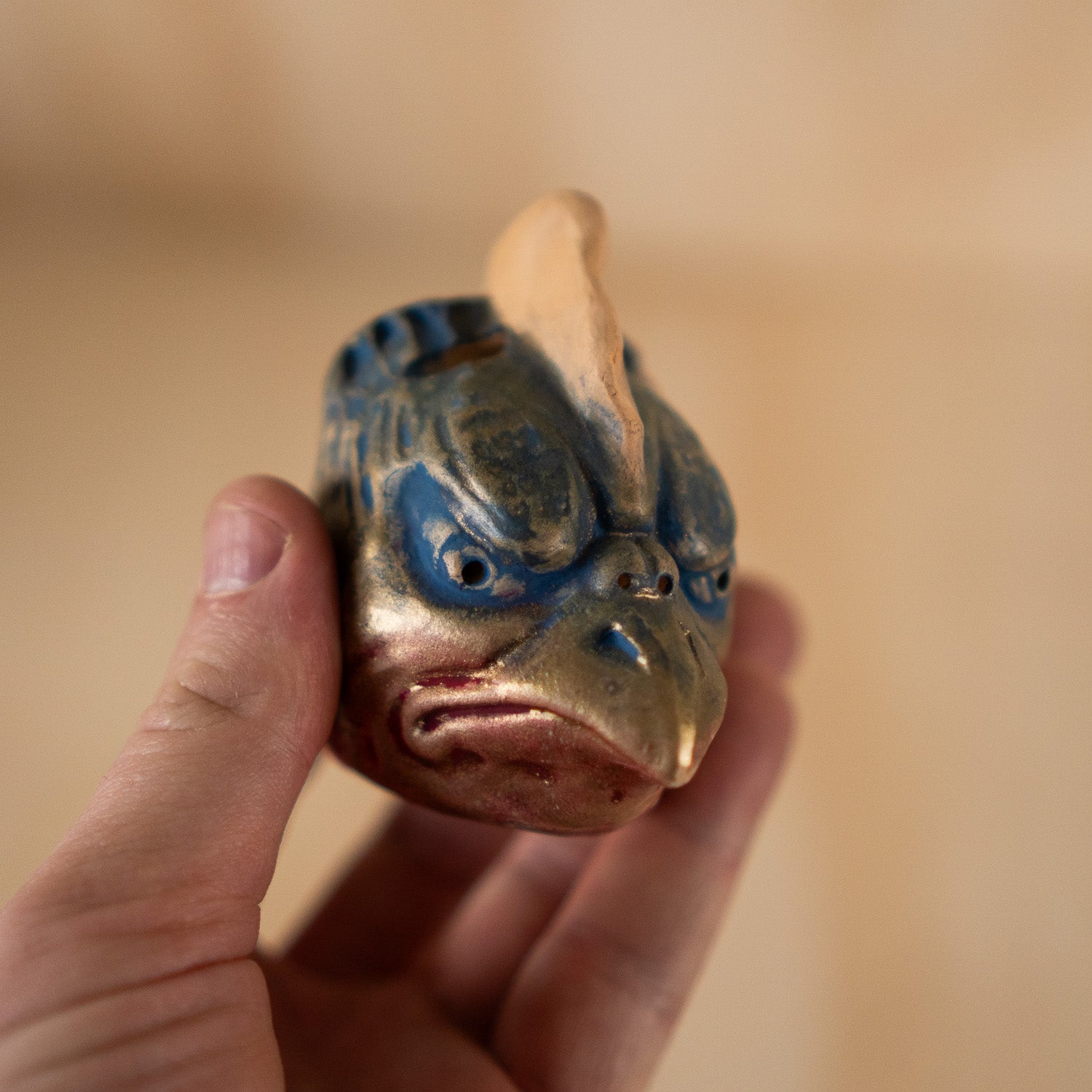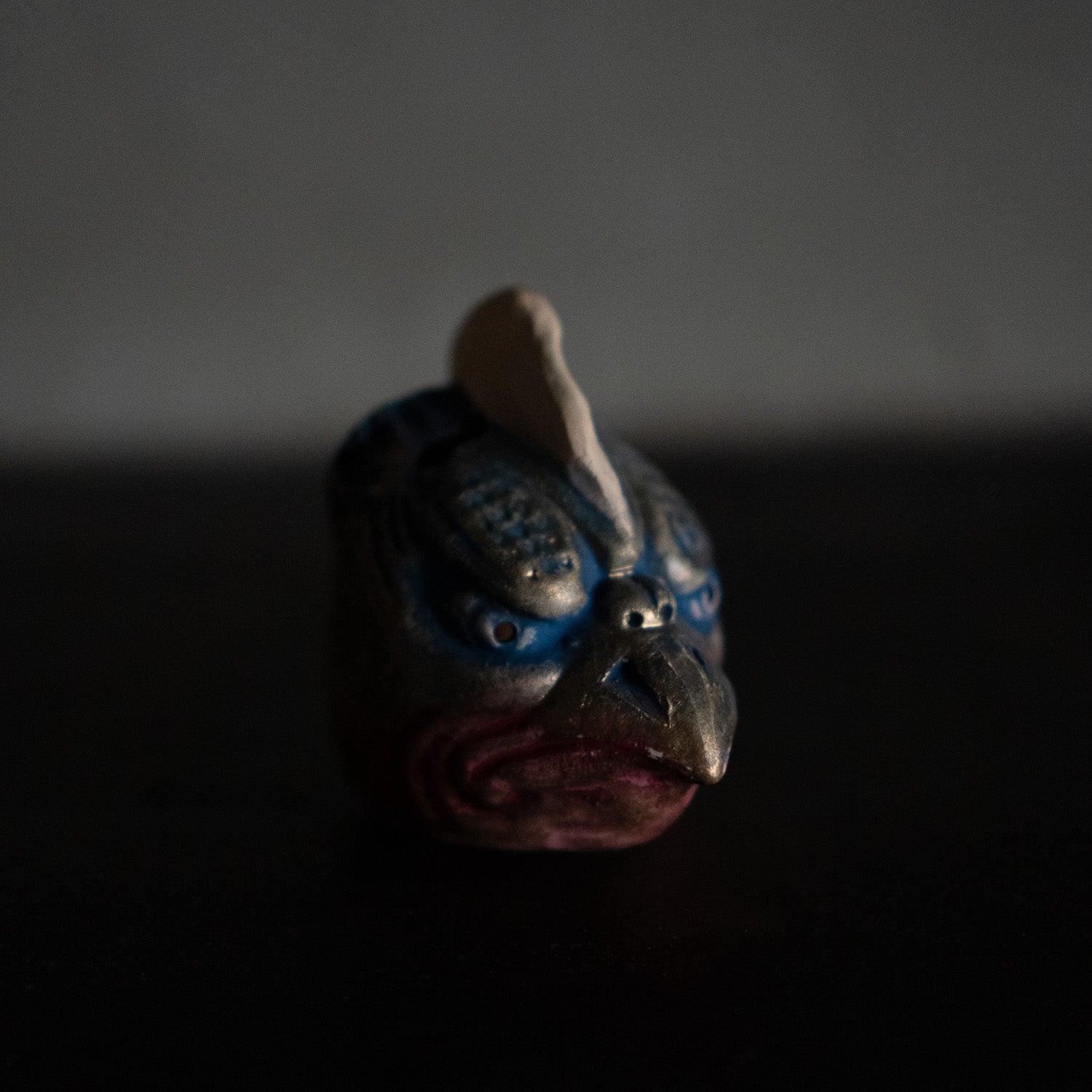This tsuchi-suzu Is a wonderful Showa period example depicting a Karasu Tengu. A bird type tengu. Tengu are creatures from Shinto Folklore, somewhere between a forest creature and a demon/ghost.