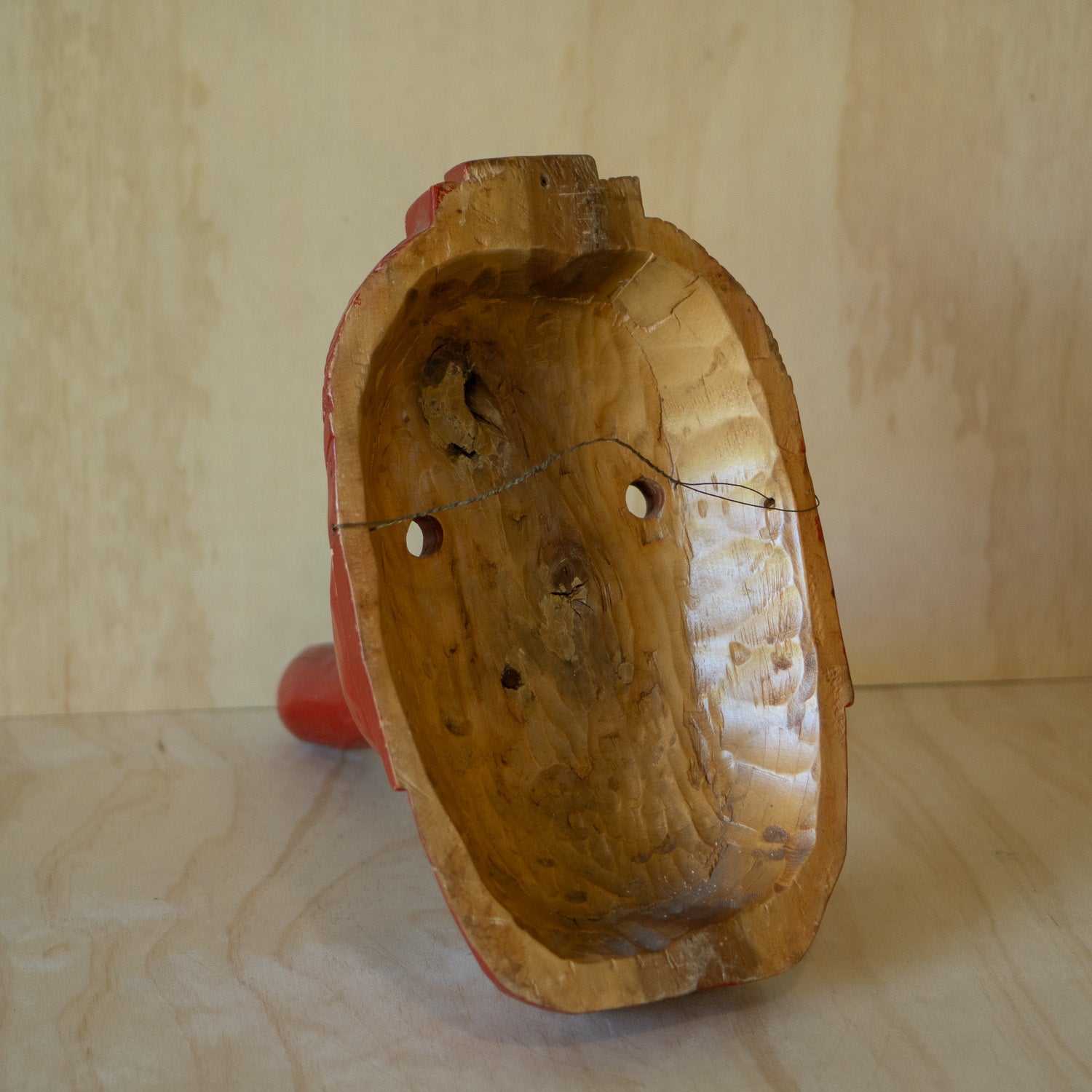 This mask is carved from Hinoki wood and lacquered in a brilliant vermillion red.