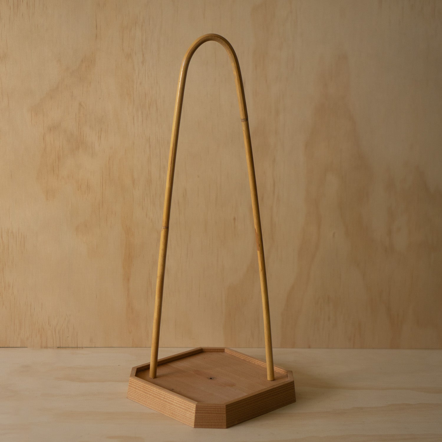 One long piece of bent bamboo forms the handle and is pinned underneath the base.