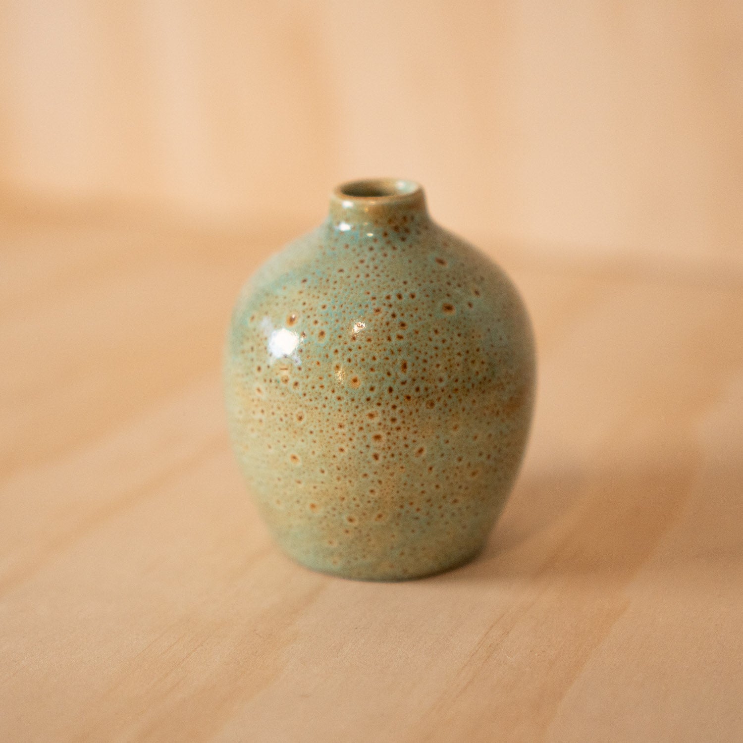 What a little beauty. A soft blue green glaze speckled with brownish orange spots caused by