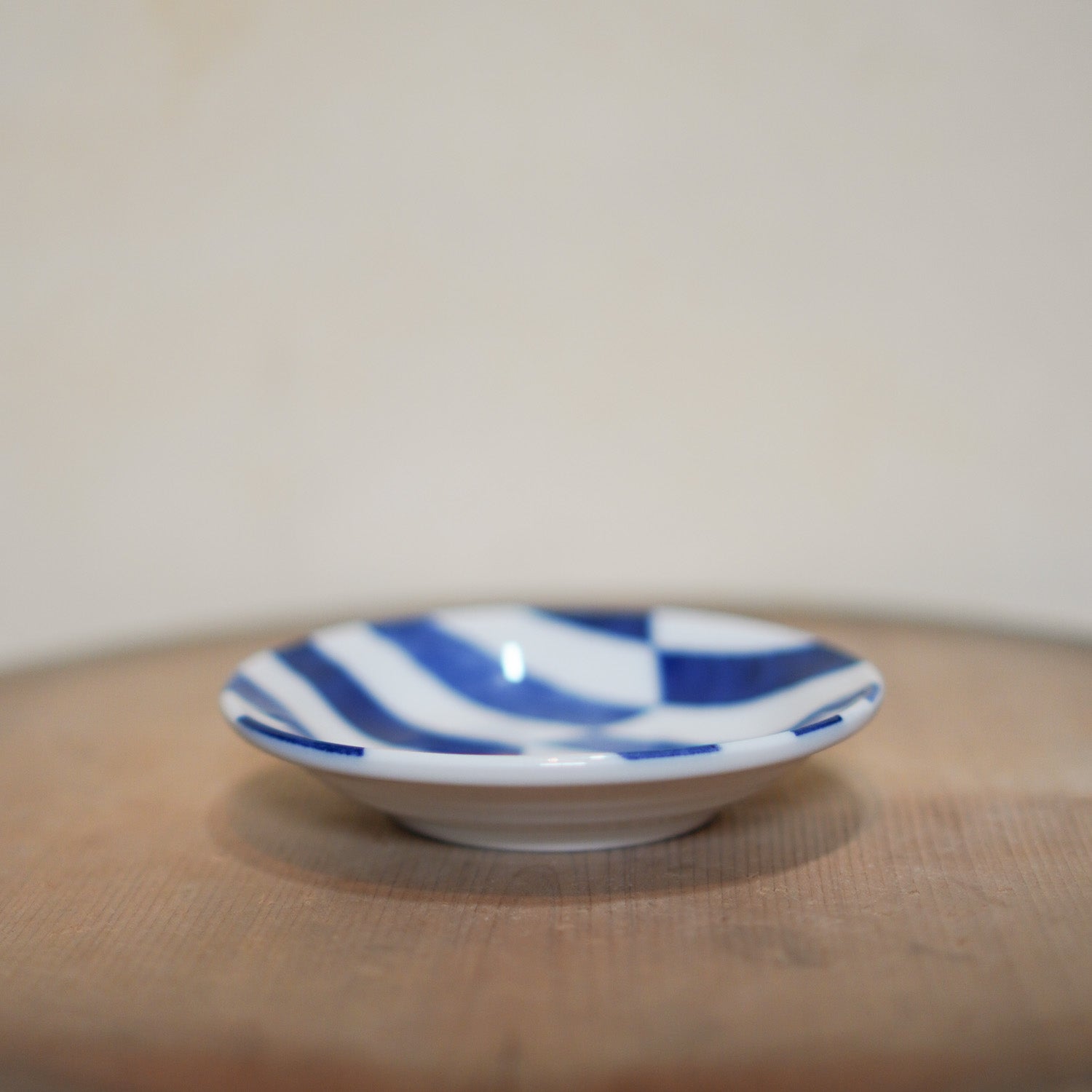 Small vintage Japanese blue and white stripe/check soy sauce dish.