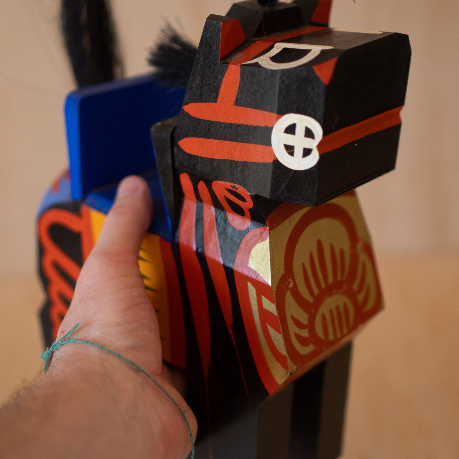 Hand made from wood, traditionally painted black using pine soot, decorated in bright primary coloured lacquer and gold. The Hair is made from hemp strands.
