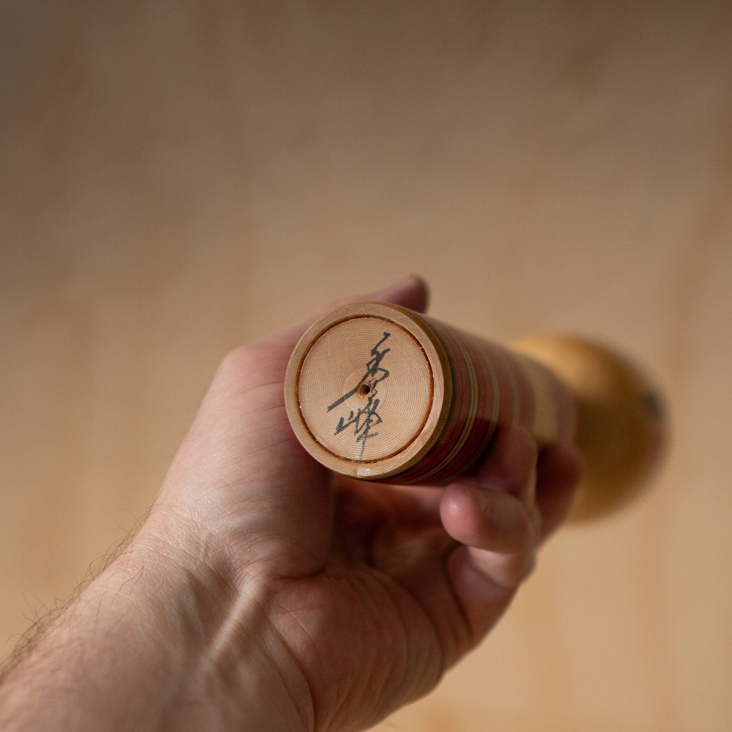 A lovely hand painted vintage kokeshi doll with red and black stripes and wisteria painted decoration. Signed to base.