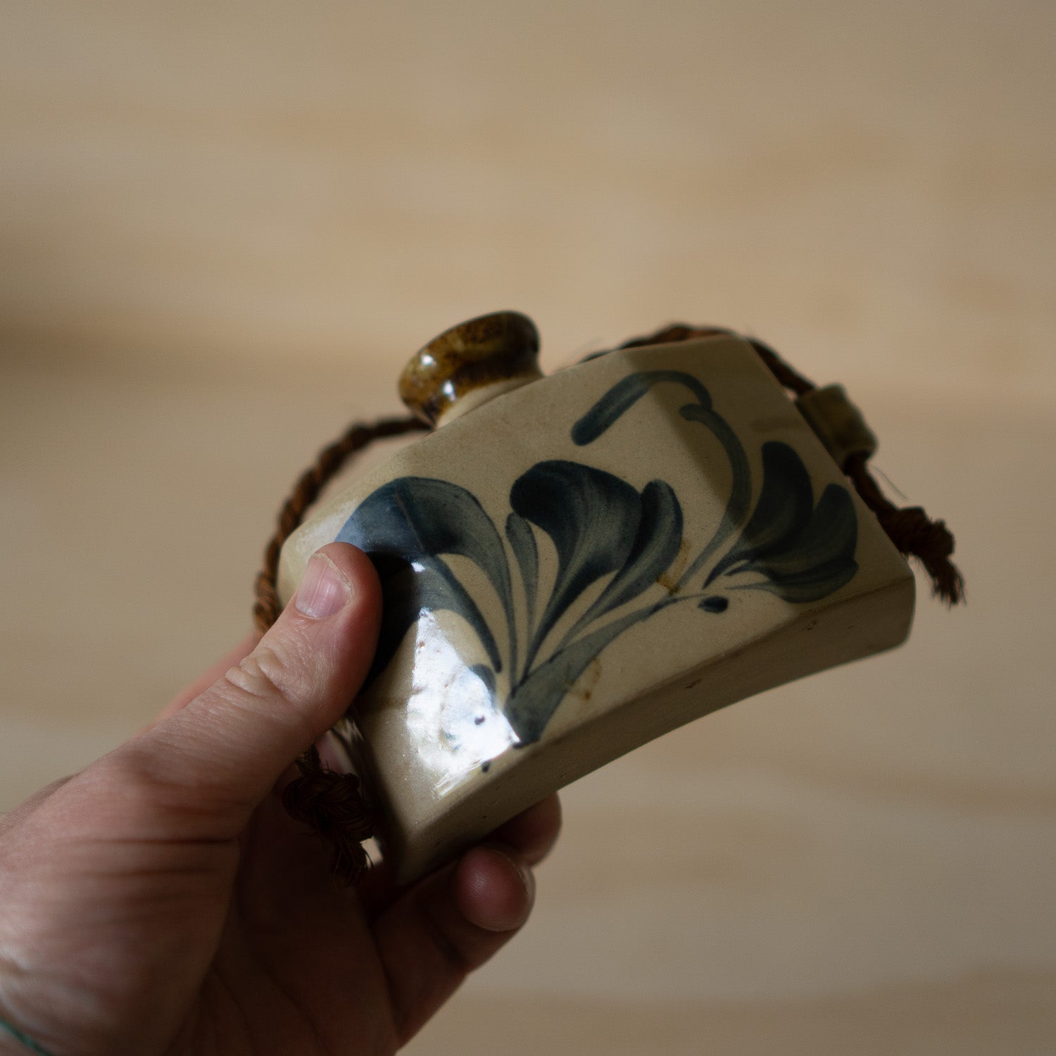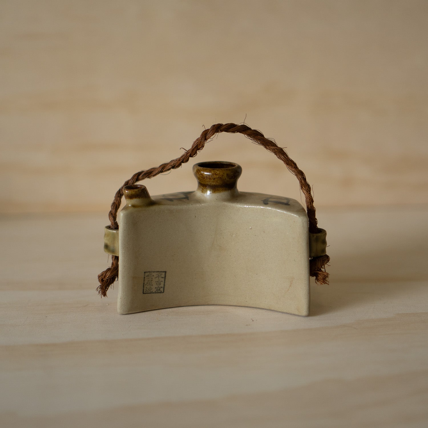 These bottles feature a crescent shape which is designed to fit more comfortably on the body when carried as a flask. This one is more likely a decorative Sake bottle for use on a table, rather than to be carried around.