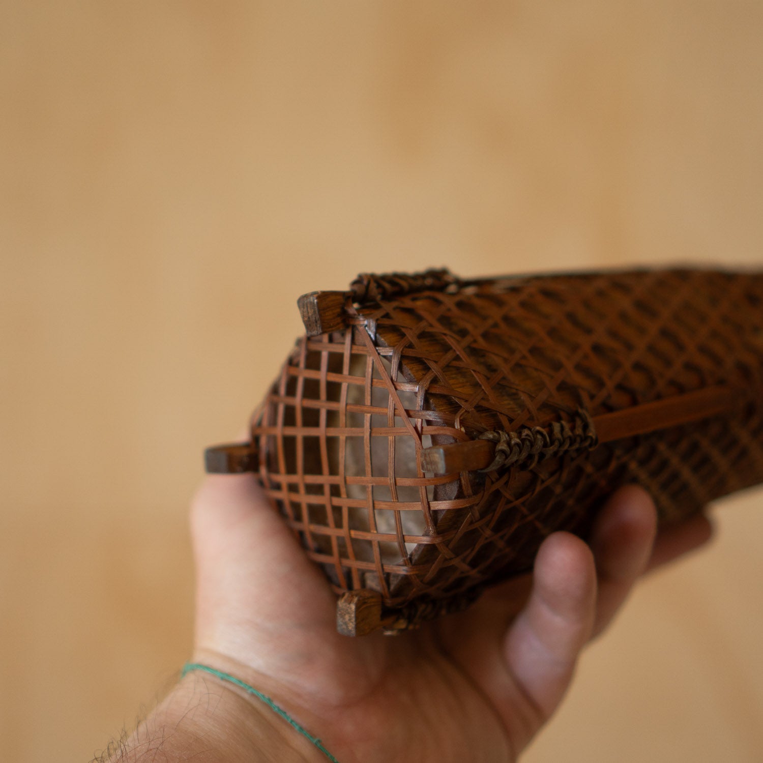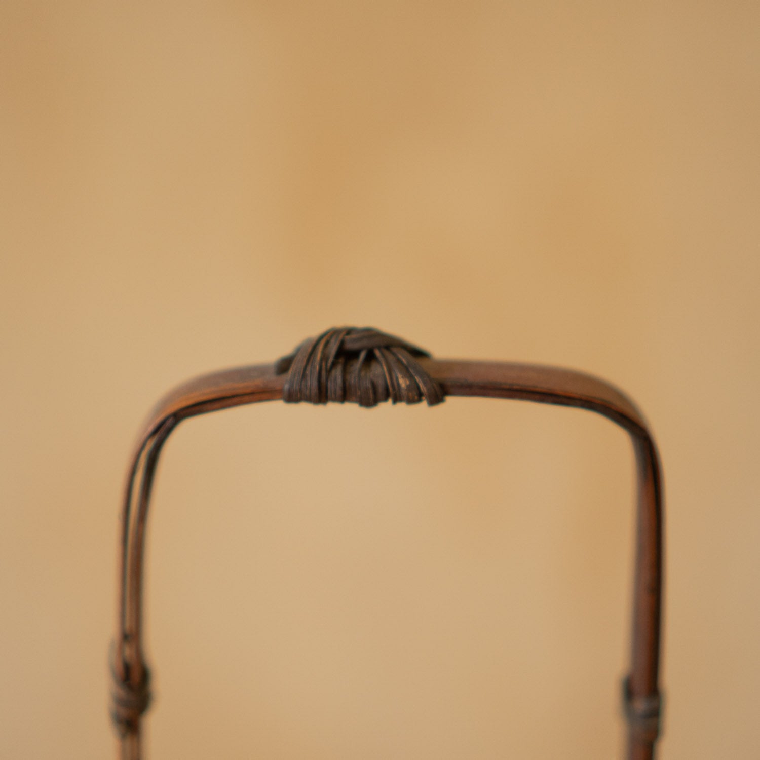 Made from finely woven split bamboo over a central vase made from a large piece of hollow bamboo. The bent bamboo handle extends to the bottom of the vase to form the feet.