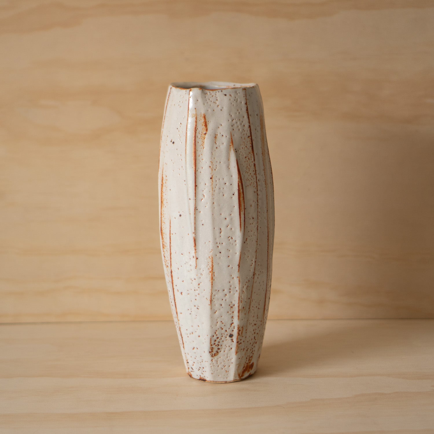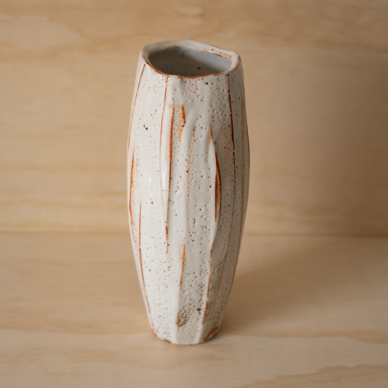 A stunning tall and slender Shino Ceramic Vase with carved details.
